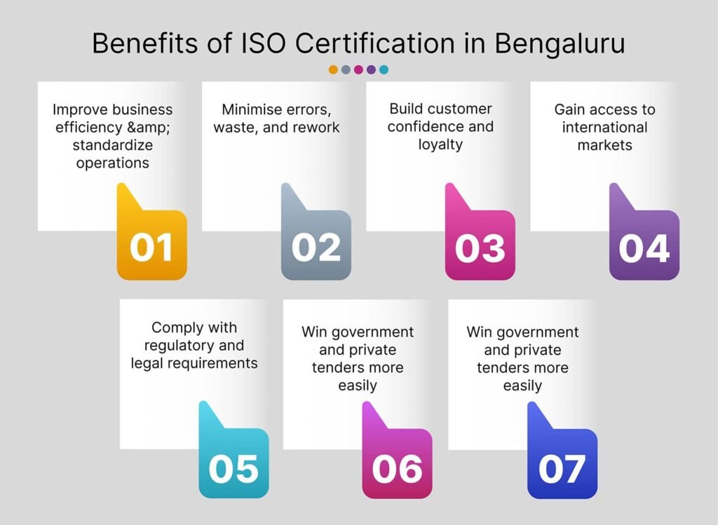 Whether you’re based in Koramangala, Electronic City, Whitefield, or Peenya Industrial Area, ISO certification offers tangible benefits: